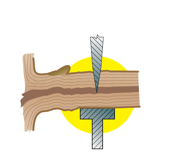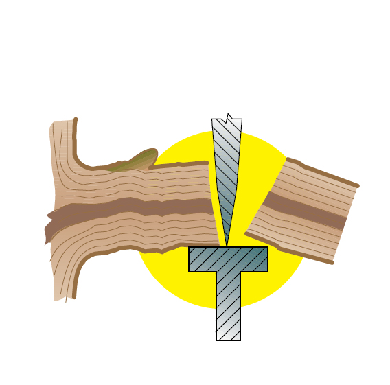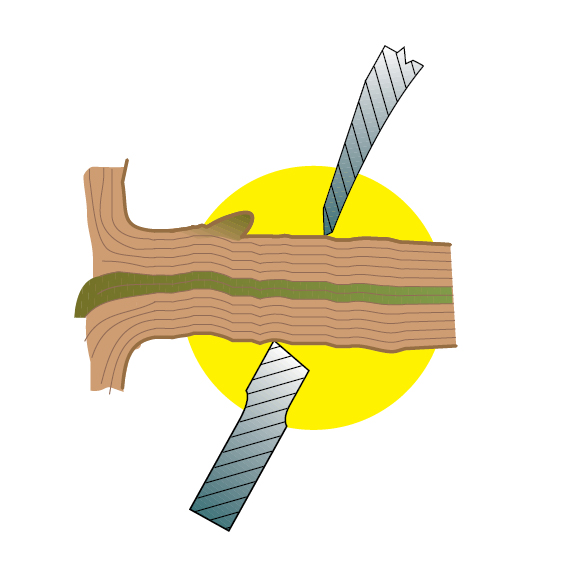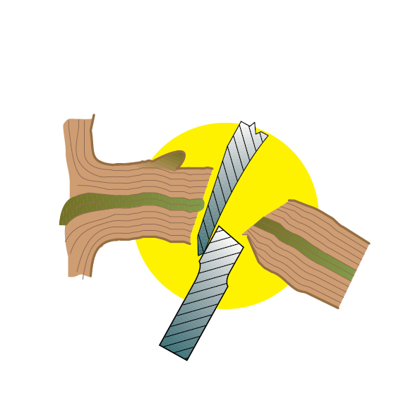Ножиците с разминаващи се остриета се използват за чисто рязане. Ножовете се разминават докато срязват дървото, което изисква повече усилие от правото рязане, но нанася по-малко щети по кората.